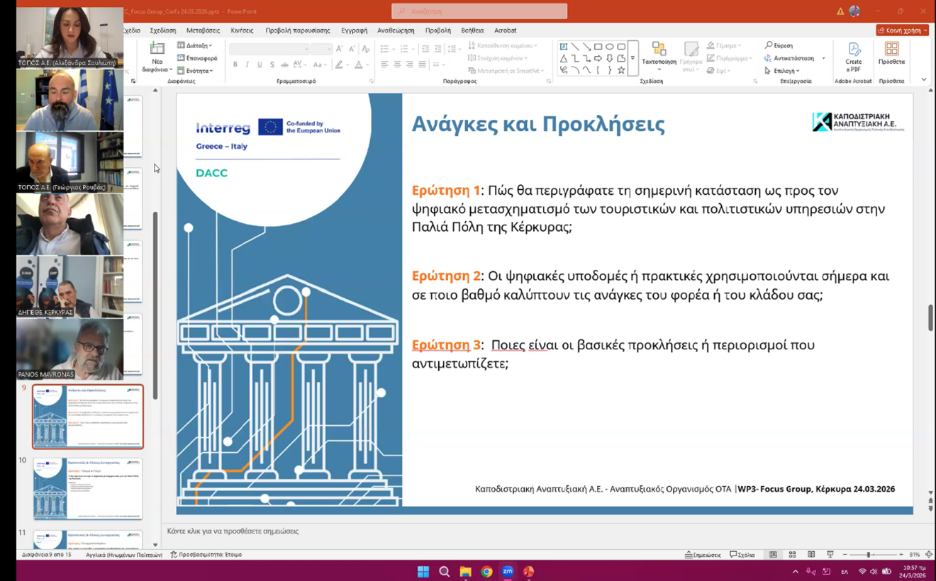 The Focus Group, organized by Kapodistriaki Development S.A., was successfully held as part of Work Package 3 of the DACC project, with the participation of representatives from local authorities, businesses, and professionals active in the Old Town of Corfu.